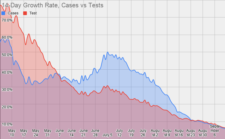 The growth rate for cases (blue) is now following the rate for tests (red).