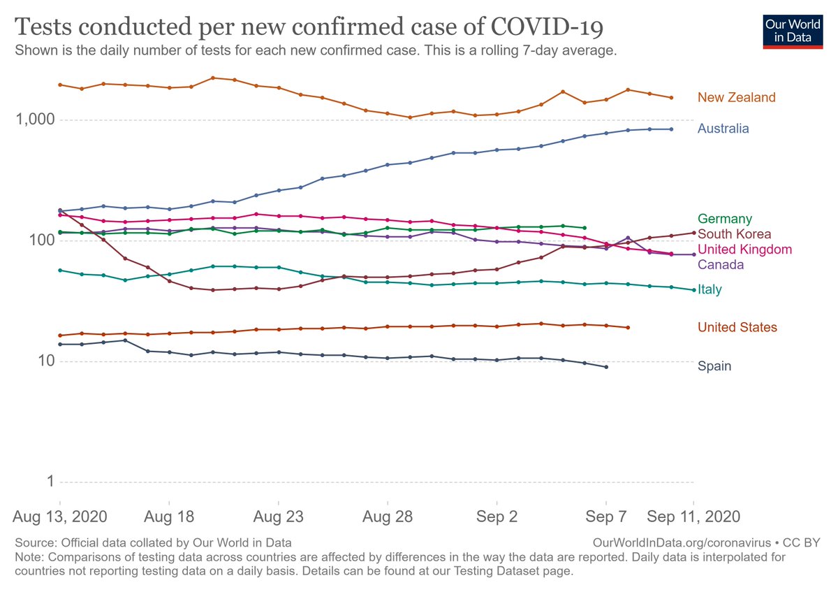 First, cases are down significantly over the past 8 wks. Testing is also down, but cases are down more. And so tests per case is up.