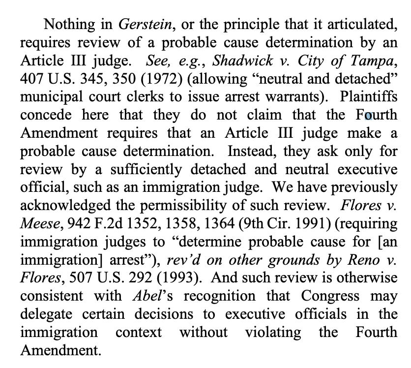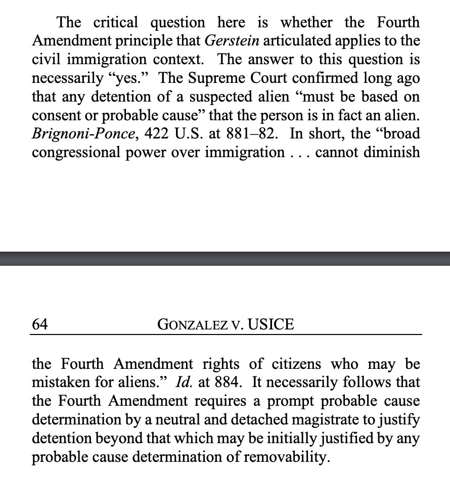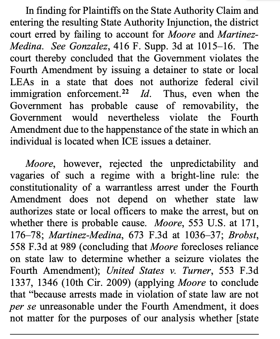(2) The feds don't violate the 4th Amendment when they ask state officers to make federal immigration arrests by issuing immigration detainers, even if the state officers lack state law authority to do so, b/c VA v. Moore says state law doesn't matter.