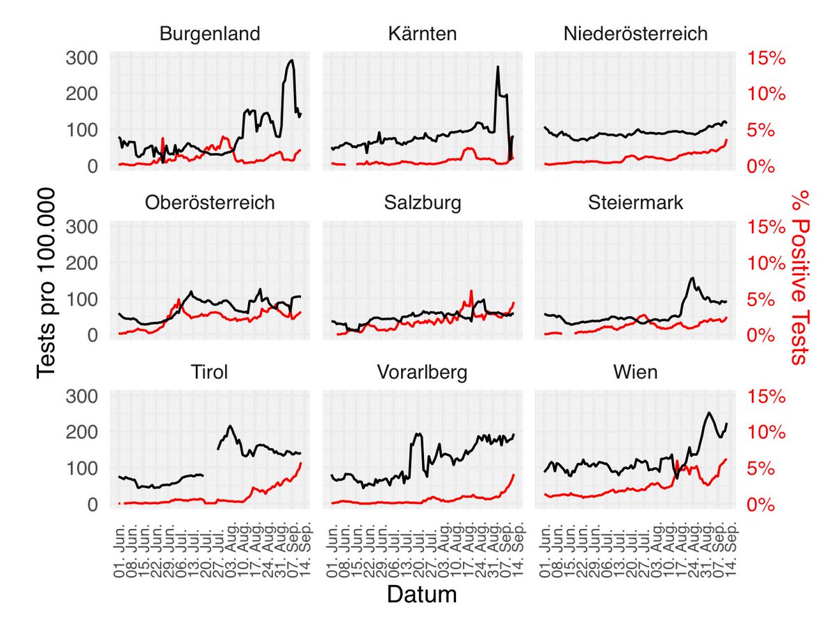 Zahl der durchgeführten Tests und Anteil der positiven Tests an der Bevölkerung in den vergangenen 7 Tagen.