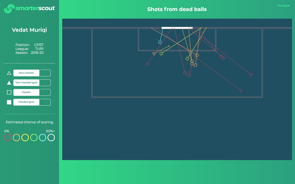 As you'd hope for with an aerial target man, Muriqi gets a lot of shots off from dead balls, too. But he's not a great finisher with his head; some of his best chances weren't even on frame.