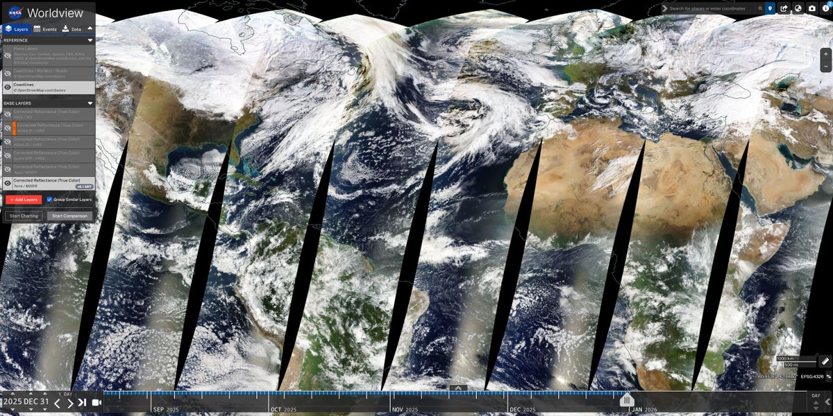🌎🛰️ Worldview: Es el visor de imágenes de satélite que se encuentran en órbita polar y que tienen cobertura diaria de todo el planeta, pero con resolución media (250 m/px) -> worldview.earthdata.nasa.gov