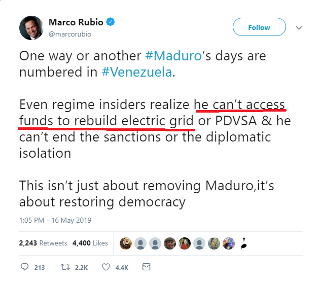 Also - wonder why Rubio didn't get suspended for this - gleefully applauding the civilian impact of Trump's criminal sanctions on #Venezuela