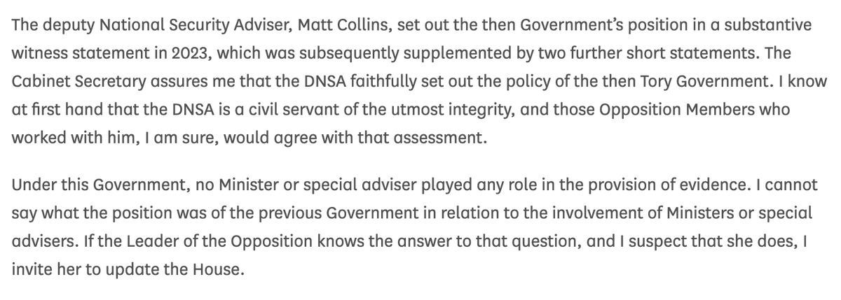 Meanwhile, the Prime Minister told the House of Commons last week that the evidence of the Deputy NSA, Matthew Collins, was produced without any particular input or interference whatsoever. /3