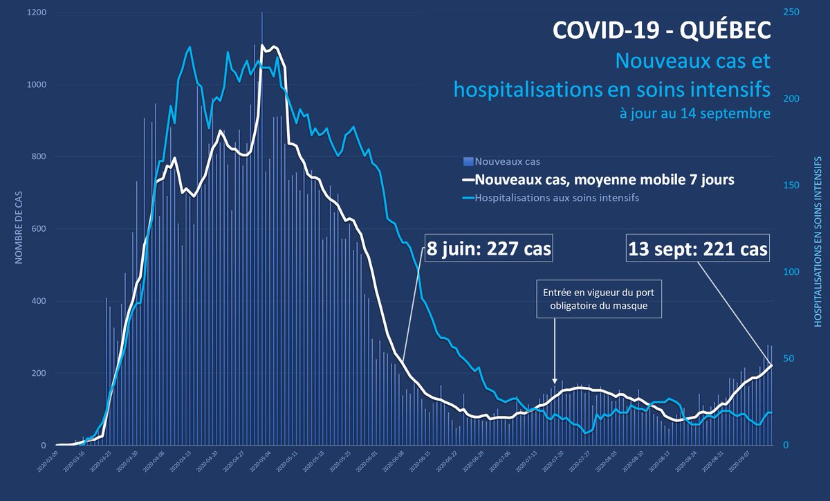 Une vue d'ensemble montre qu'en moyenne des cas sur 7 jours, le Québec est revenu où il était au début de juin, il y a un peu plus de trois mois.