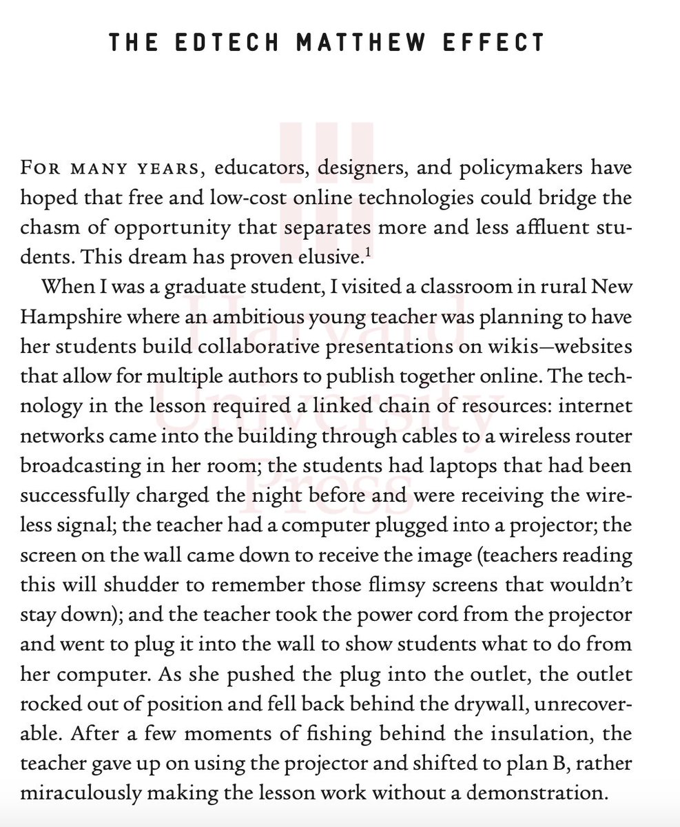 In part II of the book, I address four "As-Yet Intractable Dilemmas" that are consistent obstacles to the impact of #edtech in schools. @ddmeyer from @Desmos will come in to discuss the Curse of the Familiar. @audreywatters will come back for the EdTech Matthew Effect.