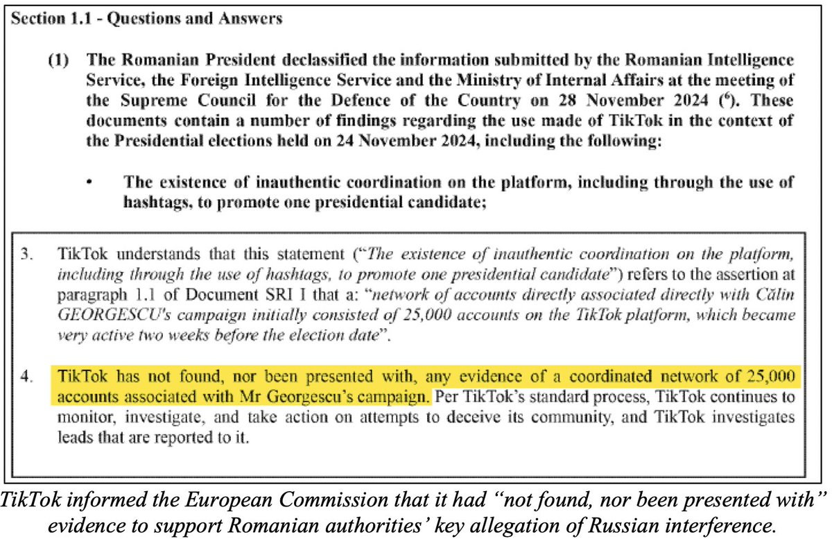 “TikTok has not found, nor been presented with, any evidence of a coordinated network of 25,000 accounts associated with Mr Georgescu's campaign.”