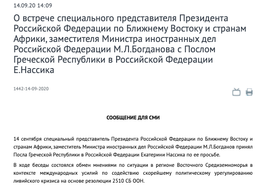 "An exchange of views took place on the situation in the Eastern Mediterranean region in the context of international efforts to promote an early political settlement of the Libyan crisis on the basis of UNSCR 2510."
