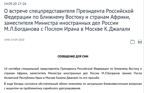 Bogdanov met with #Iran's ambassador to discuss MENA issues, particularly #Syria [and presumably how Iran should respond to Bahrain/UAE normalization with Israel]