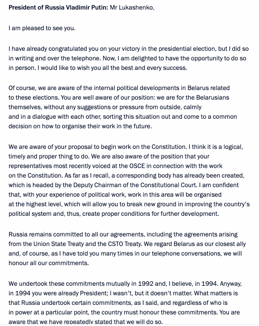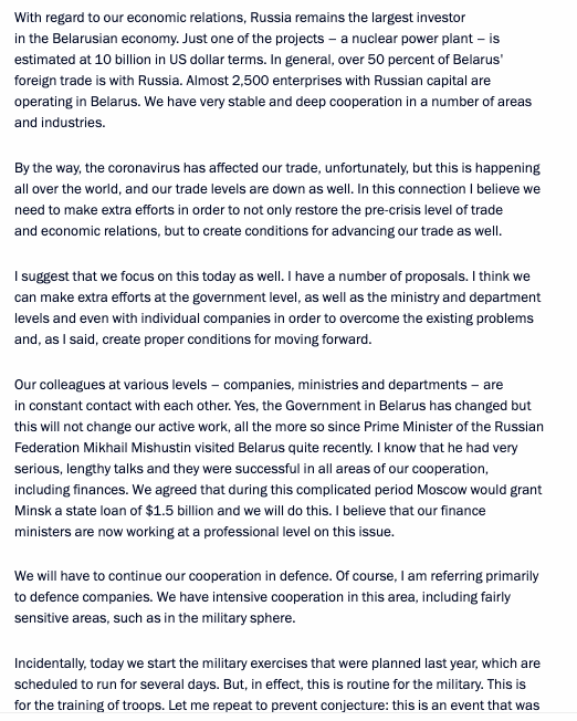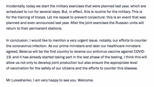 Putin- #Lukashenko meeting: "Incidentally, today we start the military exercises...Let me repeat to prevent conjecture: this is an event that was planned and even announced last year. After the joint exercises the Russian units will return to their permanent stations."
