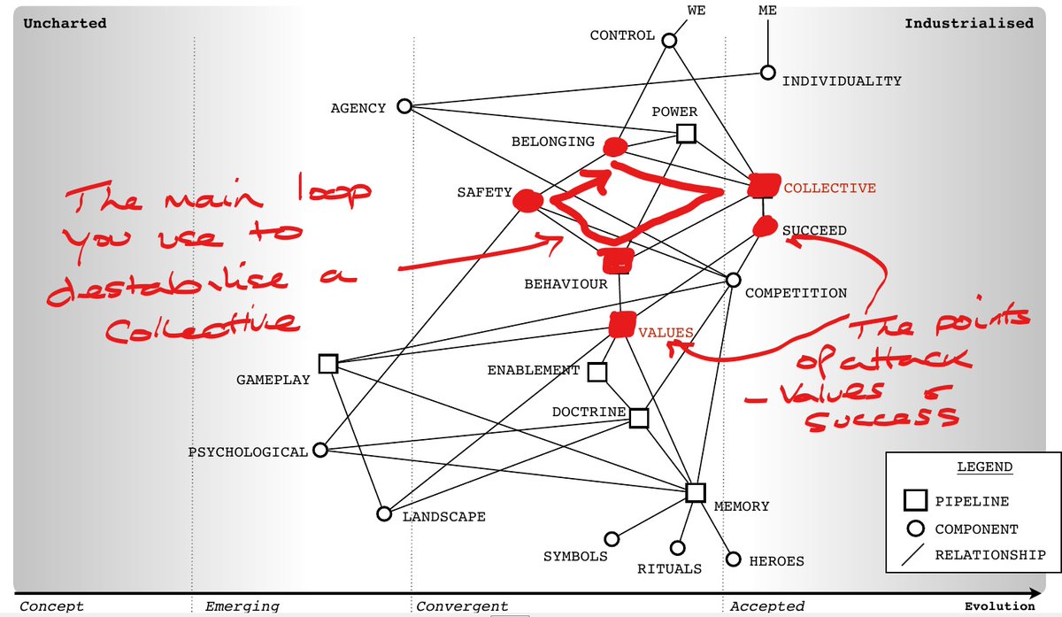 i.e. you want to turn the collective against itself, to create a negative loop that destabilises it and destroys it from within. The points of attack are its image of the collective's success and leadership behavior vs collective's values.