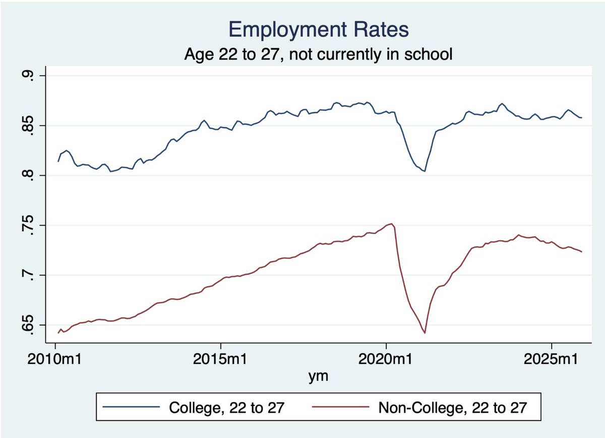 @mtkonczal This is in contrast to my graph, the employment population ratio for those not in school. I've adjusted to focus on age 22-27 as he does to be comparable