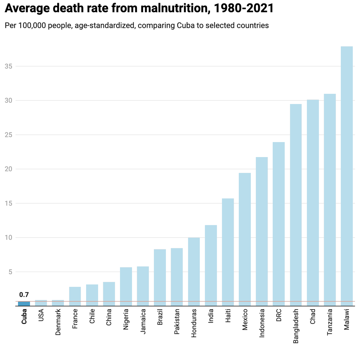 Cuba's food system is a great example of this. Cuba developed a public food system that guarantees everyone has access to basic nutritional requirements. Thanks to this system, Cuba has one of the lowest death rates due to malnutrition in the world, lower even than in many high-income countries, such as the United States, Denmark and France.