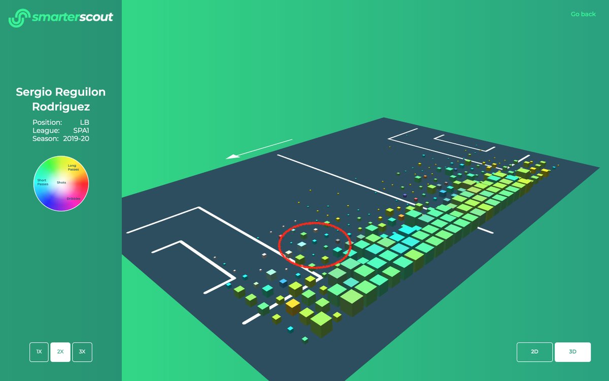 Looking at Reguilón's positioning, we can see that he cuts a wide swath on the flank, looking for shorter passes. He can come further inside before he gets to the opposition penalty area, and this can result in shots that are rather straighter on goal than for most LBs:
