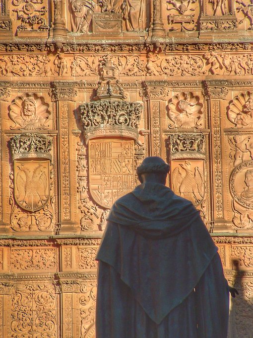 ¿Saben que la Universidad de Salamanca fue la primera institución educativa en obtener el título de Universidad en Europa? Y esta es su fachada. El escudo que pueden ver a la izquierda de la estatua de Fray Luis de León es el del emperador y rey Carlos. (sigue)