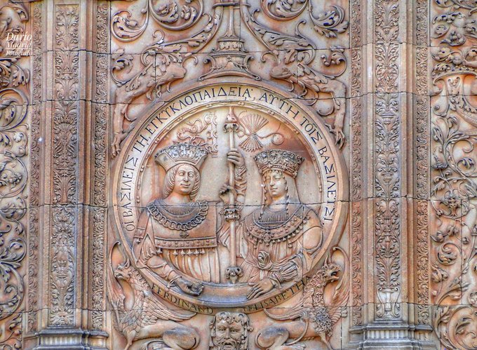 Pues aquí los tienen a los Reyes Católicos con sus yugo y sus flechas. Están representados en un medallón que agradece a los monarcas su apoyo a la Universidad de Salamanca: "La Universidad a los Reyes y los Reyes a la Universidad". ¿Y dónde está la famosa rana?