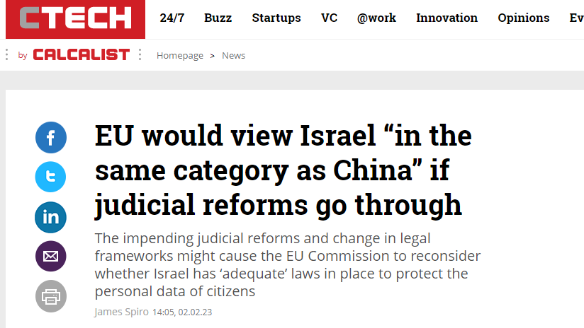 מגזין טכנולוגי מבית כלכליסט מפרסם כתבה עם כותרת מבהילה: "האיחוד האירופי עלול להציב את ישראל באותה קטגוריה כמו סין אם הרפורמה תעבור".