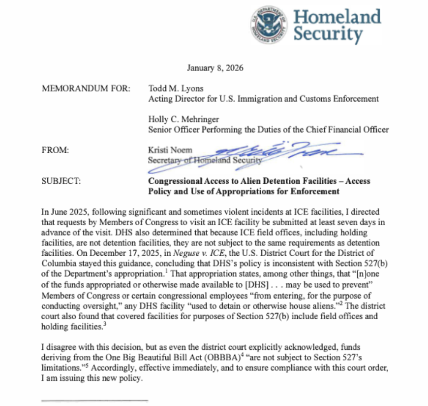 BREAKING: A day after the Minneapolis shooting, Secretary Noem quietly signed a new policy barring congressional visits to ICE facilities without a week's advance notice.