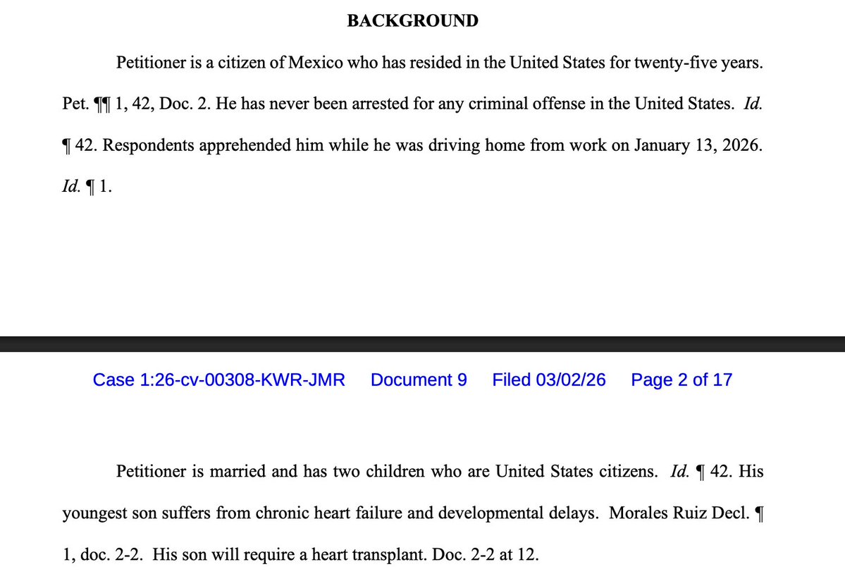 Judge Kea Riggs, a Trump-appointed judge from Arizona, has ordered ICE provide a bond hearing a man in the United States for 25 years with no criminal record, who is the father of two US citizen kids, one of whom needs a heart transplant. storage.courtlistener.com/recap/gov.usco…