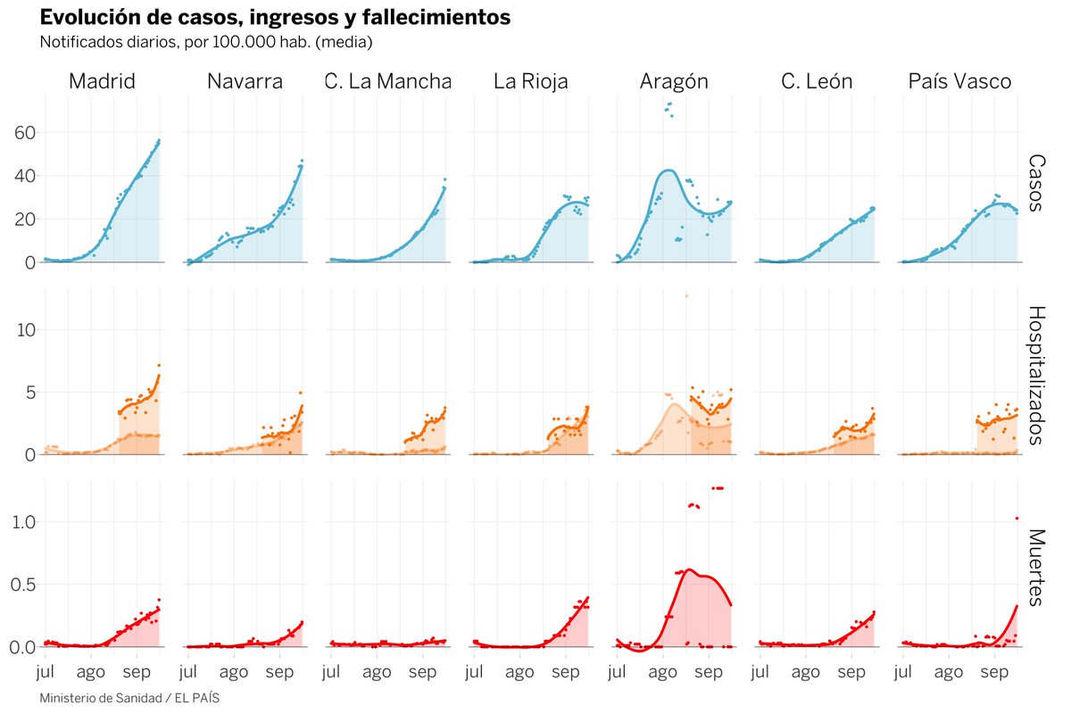 2/ [Corregido] Aquí las seis comunidades con más casos diarios: Madrid, Navarra, C. La Mancha, La Rioja, Aragón, C. León y País Vasco. En casi todas la tendencia se ve peor: