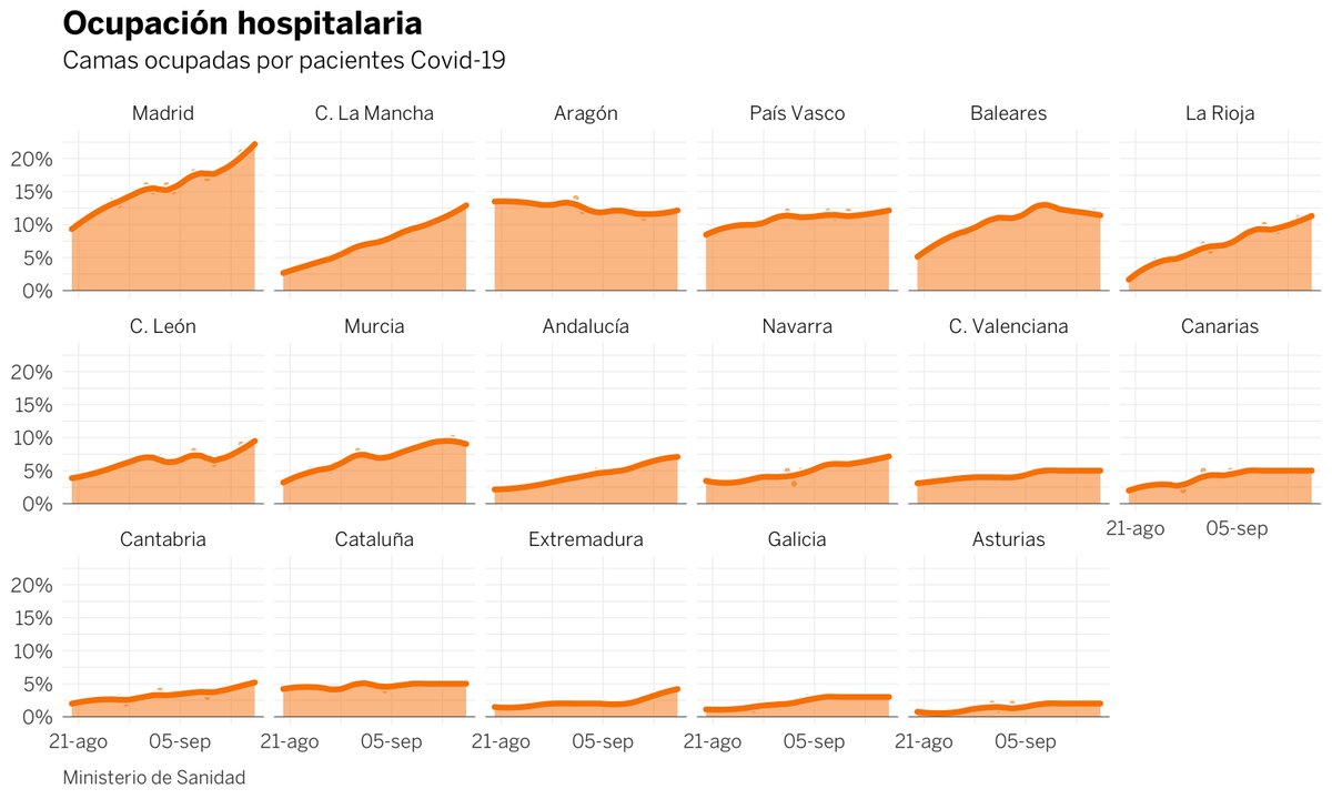 4/ Por último: la ocupación de los hospitales. Subida sin freno en Madrid. Subidas también en un puñado de comunidades. (Y las UCI están en general peor.)