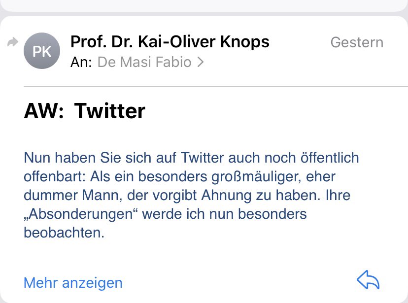 Ein seltsamer Typ. Zitat in E-Mail an mich: Sie sind ein „besonders großmäuliger, eher dummer Mann, der vorgibt Ahnung zu haben.“ Und dann „Schade dass Sie sich so angegriffen fühlen!“ Ist das die angemessen Verhaltensweise für einen Prof der @unihh ? @KaiOliverK