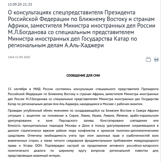 Putin's MENA envoy Bogdanov met with #Qatar's Foreign Minister in Moscow for an in-depth discussion of #Syria, #Libya, #Iraq, #Lebanon, #Yemen, an Arab-Israeli settlement and the Persian Gulf.