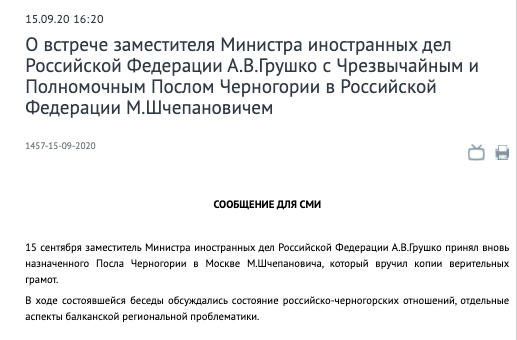 Deputy Foreign Minister Grushko met with #Montenegro's ambassador to discuss "regional problems in the #Balkans"