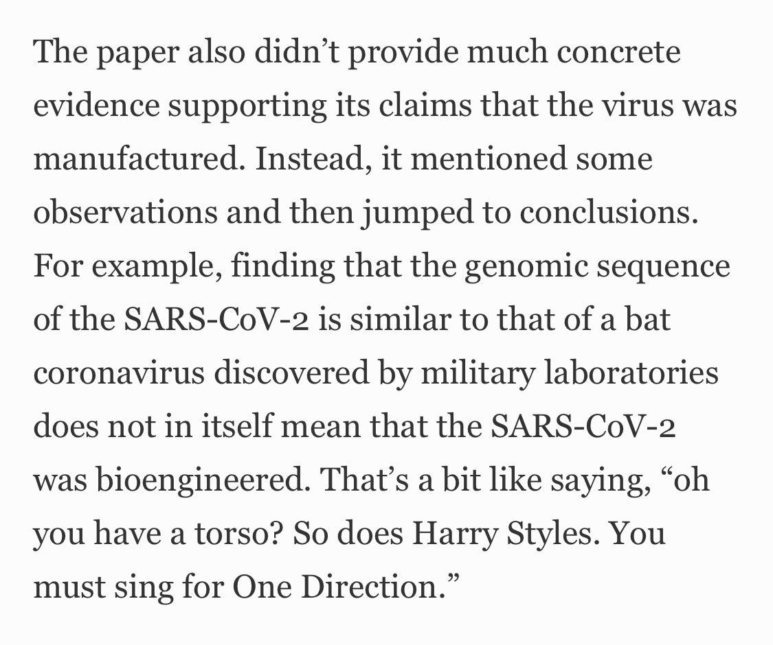 该文没有提供具体证据来佐证病毒是人造的。 相反,它谈了些观察然后就得出结论。 例如,发现SARS-CoV-2的基因组序列与军事实验室内发现的蝙蝠冠状病毒的基因组序列相似,这本身并不意味着SARS-CoV-2是经过生物工程改造的。 Image