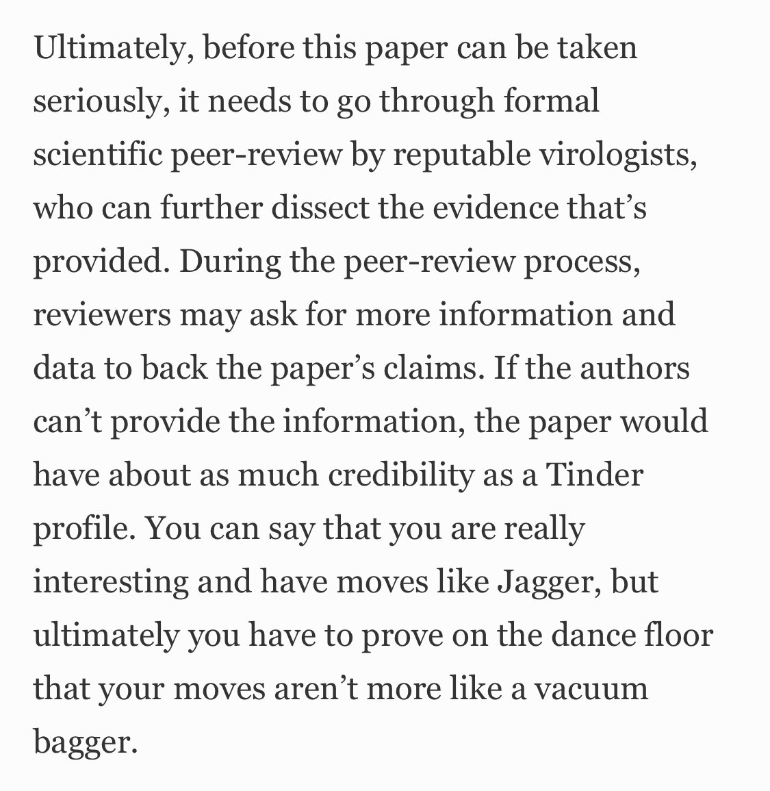 最后在此文闪亮登场前,需要知名病毒学家的正式的科学同行评审,他们可以进一步剖析所提供的证据。 在同行评审过程中,审稿人可能会要求提供更多信息和数据以支持论文的主张。