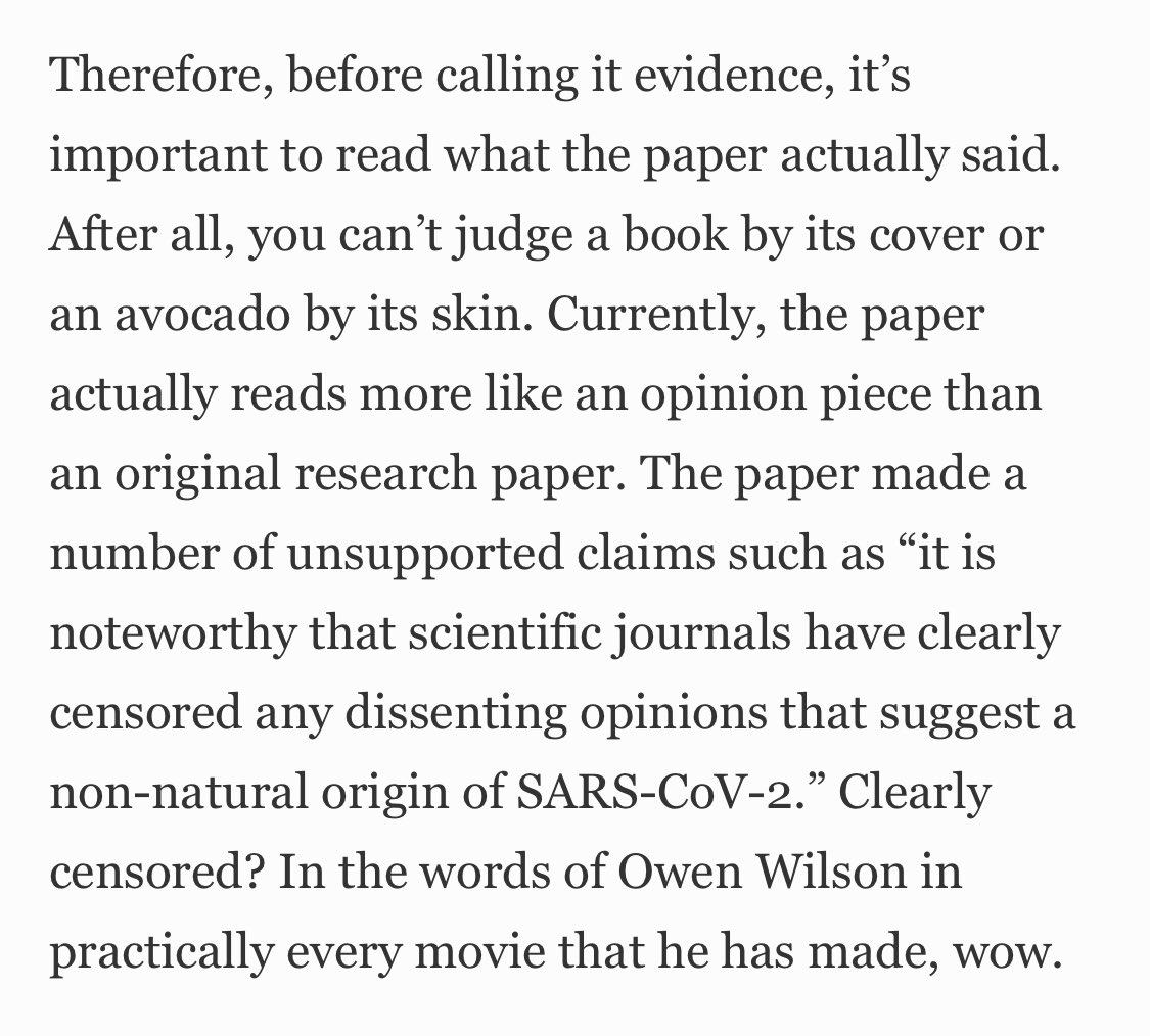 目前,该“论文”实际上读起来更像是一篇观点文章,而不是原创的研究论文。 该文提出了许多无佐证的主张,比如:“值得注意的是科学期刊已经明确审查有关SARS-CoV-2非自然源的不用观点。