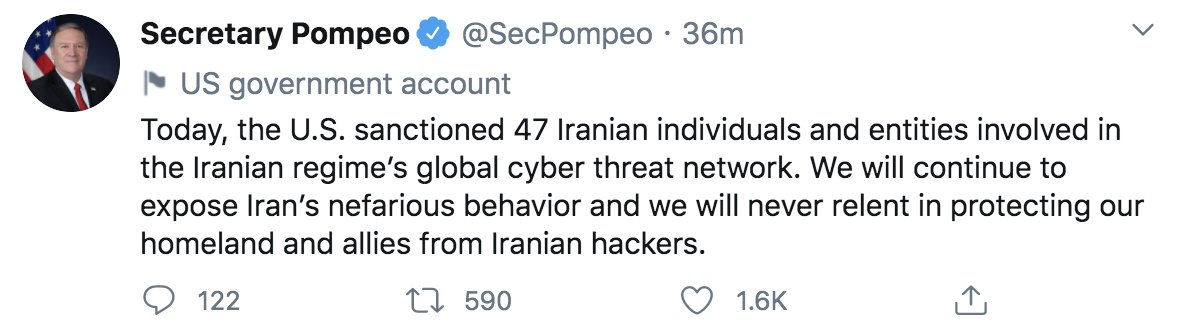 #BREAKING: @SecPompeo says the #US has sanctioned 47 #Iranian individuals, entities involved in the regime’s global cyber threat network arab.news/vju6j Image