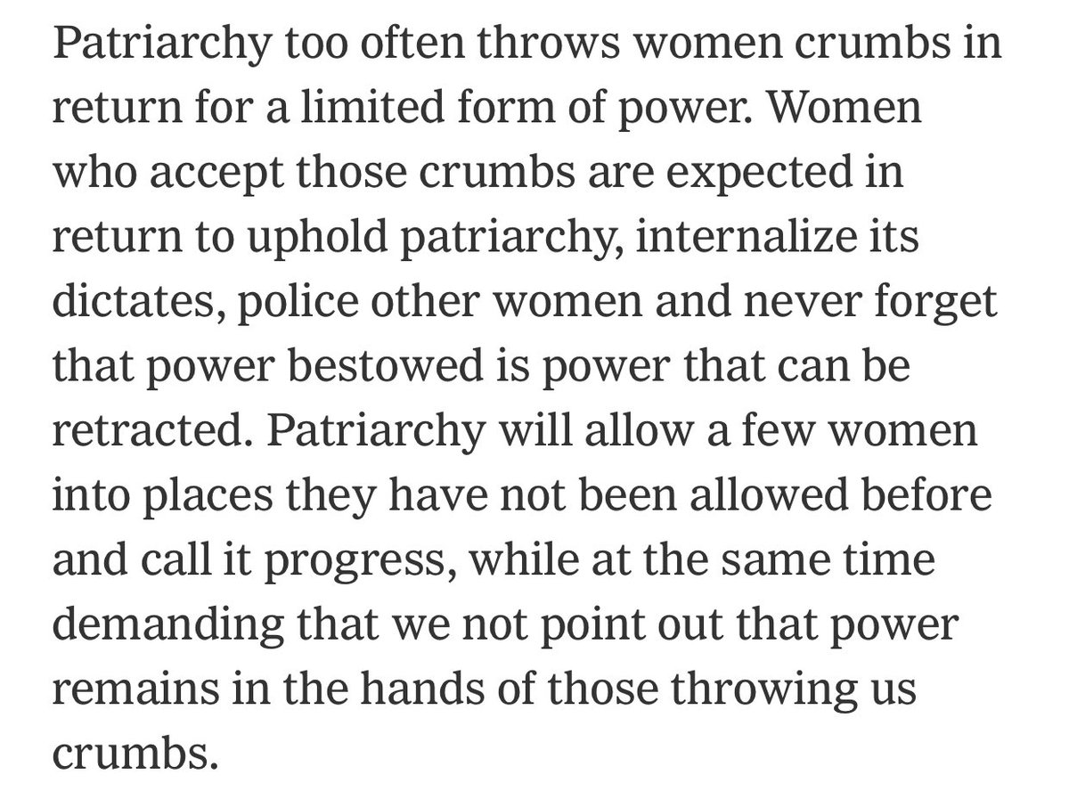Patriarchy too often throws women crumbs in return for a limited form of power. Women who accept those crumbs are expected in return to uphold patriarchy, internalize its dictates, police other women and never forget that power bestowed is power that can be retracted.