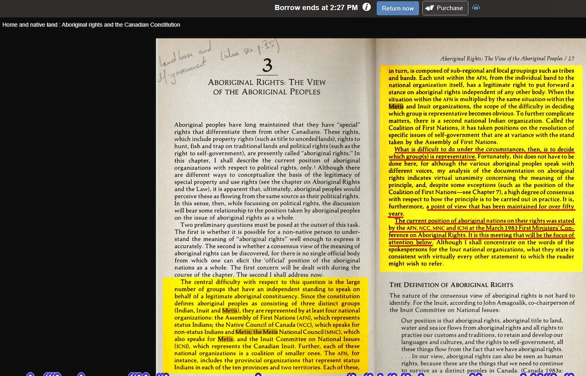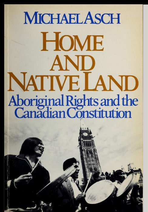 Home and native land- Aboriginal rights and the Canadian Constitution by Asch, Michael 1984 - Bill Wilson - NCC - international law definitions -Metis, Inuit and Indian- this country belongs to us.