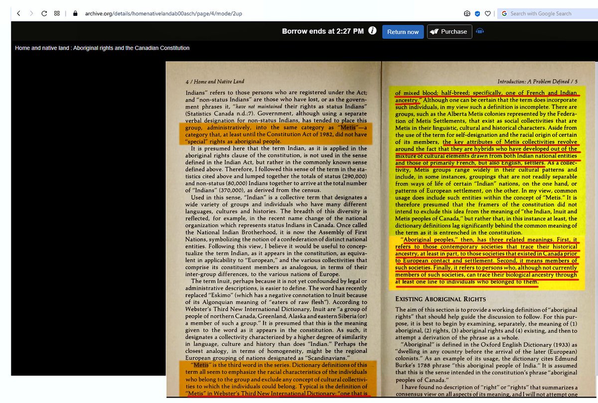 Home and native land- Aboriginal rights and the Canadian Constitution by Asch, Michael 1984 - Metis dictionary definition one that is mixed blood-half-breed- specifically one of French and Indian ancestry.