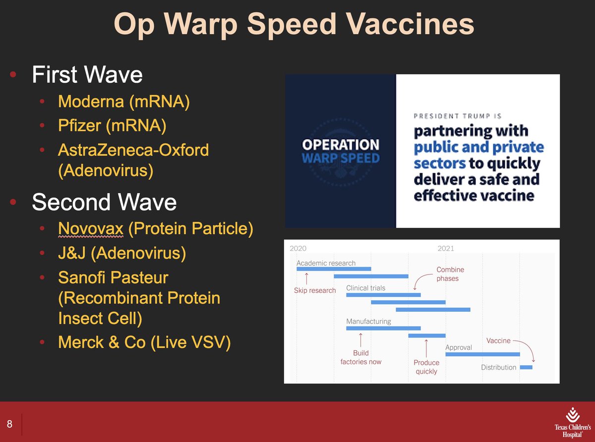 7/ @ 14:52: Major U.S. effort is Operation Warp Speed, focused on pharma companies (@bcmhouston is working on its own vaccine, outside OWS). Speed is not so much to rush clinical trials, but to gear up manufacturing and distribution to save time once we find a good, safe vaccine.