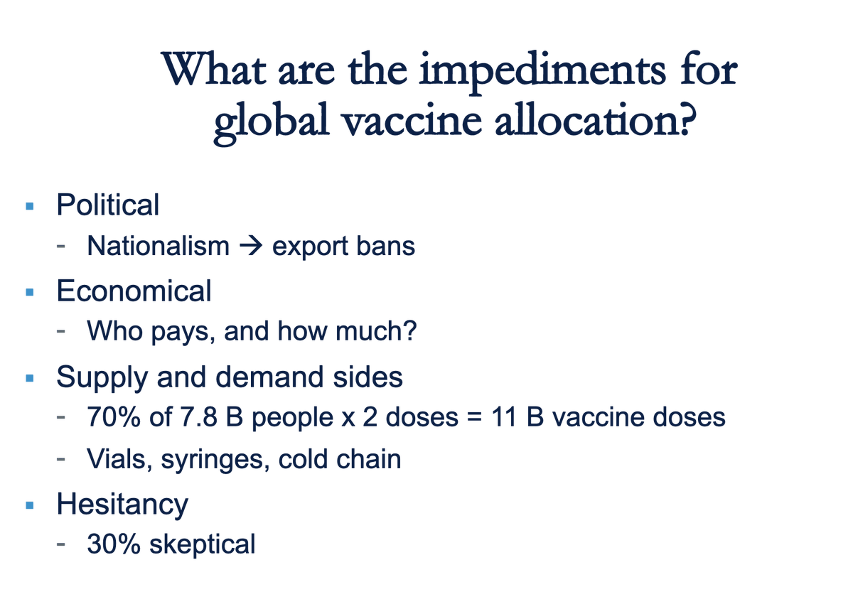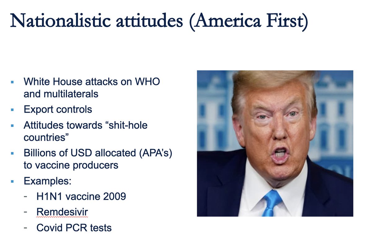 12/ Next, Jaime Sepulveda, head @IGHSatUCSF, reviewed process of global vaccine allocation. @ 40:00, he sees 4 obstacles to global vaccine distribution (Fig on L). While vaccine nationalism is not unprecedented, “racist attitudes” from White House make it worse (Fig R).