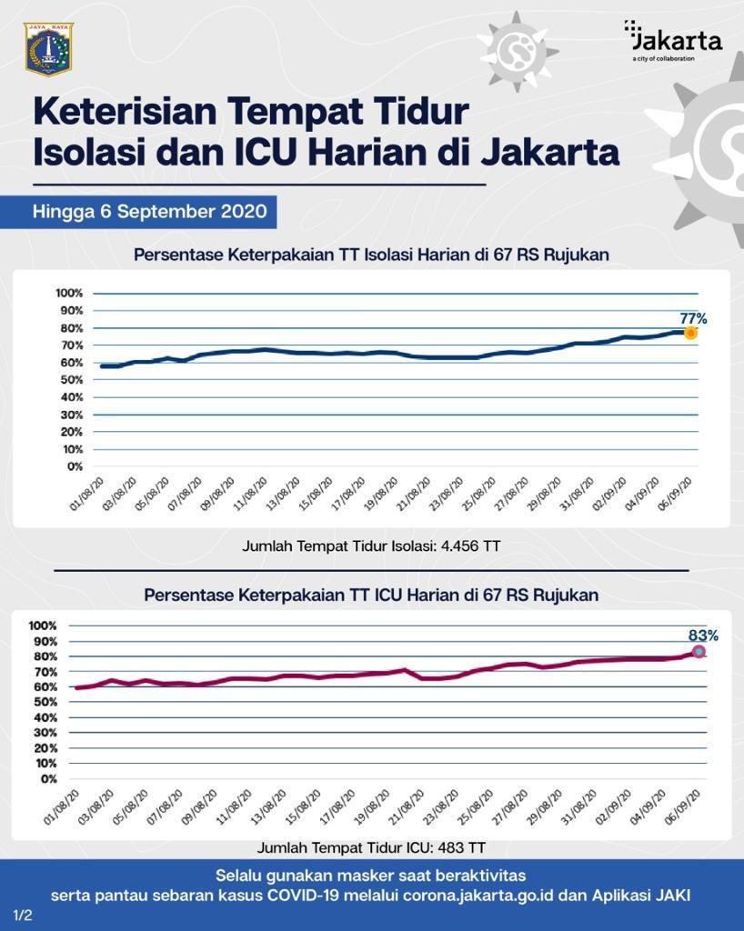 Di sisi lain, ruang ICU telah terpakai 83% dari kapasitas maksimal 594 tempat tidur atau sebanyak 493 bed