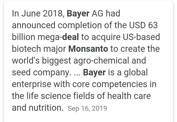 2016 साली बायर या प्रतिष्ठित केमिकल कंपनीनं मोन्सॅन्टो या तितक्याच कंपनीचा घास घेतला.. दोन्ही कंपन्या तशा तगड्या.. म्हणजे वय, मिळकत, दर्जा सगळं सगळं रुबाबदार.. साहजिकच उद्योग झेपत नाही म्हणून त्या एकत्र आल्याचं नसणार. 👇
