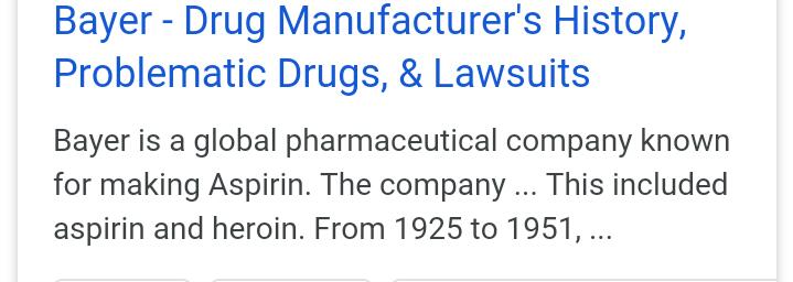 सुरवातीला ती ऍस्पिरिन बनवायची..नंतर ती हेरॉईन बनवायला लागली.. ही दोन्ही अपत्य तिचीच.. खोकल्यावर औषध म्हणून हे हेरॉईन तेंव्हा औषधात वापरायचे.. खोकल्याच्या औषधाने गुंगी यायची ती त्यामुळेच..👇