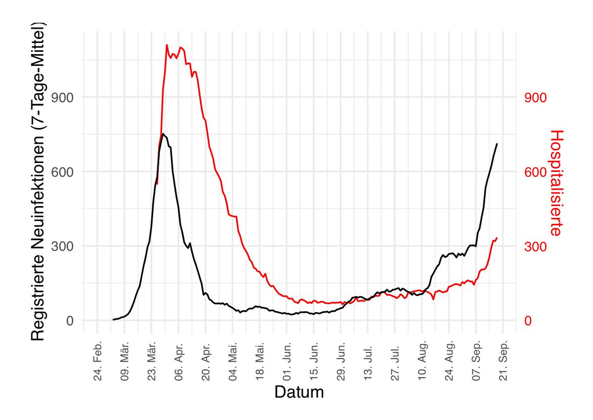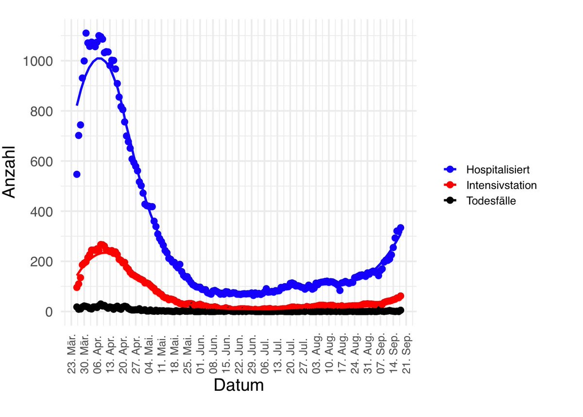 Zahlen der Hospitalisierten und Intensivpatienten steigt deutlich. Derzeit ungefähr 1/3 des Höchstands im April bei Hospitalisierten und 1/4 bei Intensivfällen.