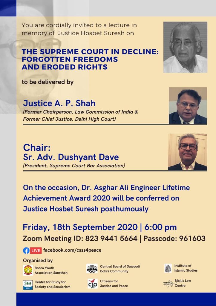 Justice Hosbet Suresh will be posthumously conferred with the Dr. Asghar Ali Engineer Lifetime Achievement Award, 2020.