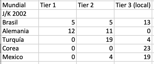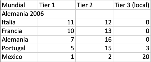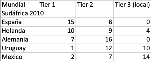 Ahora Sudáfrica, donde el Tier 1 tiene 33 jugadores de entre los semifinalistas, el Tier 2 45, y el Tier 3 14, casi todos uruguayos. ¿Empiezan a detectar un patrón? Y pues México sigue estando muy muy atrás, aunque por lo menos ahí teníamos dos en Tier 1 (Rafa y Vela) 😅