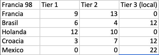 Retrocedamos 4 años más, ahora a Francia 98. Ahí existía ya la Ley Bosman, pero todavía no se sentían tanto sus consecuencias. Y en los semifinalistas hubo 30 jugadores de Tier 1, 34 de Tier 2 y 24 de Tier 3. México tuvo, por última vez, puros jugadores de Tier 3.