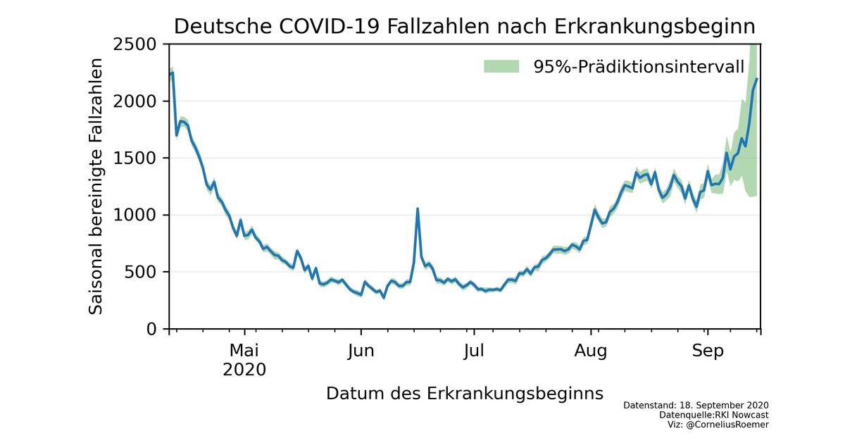 German laboratory-confirmed SARS-CoV-2 new infections after the onset of the disease, statistically adjusted for the typical weekly fluctuations, since mid-April.