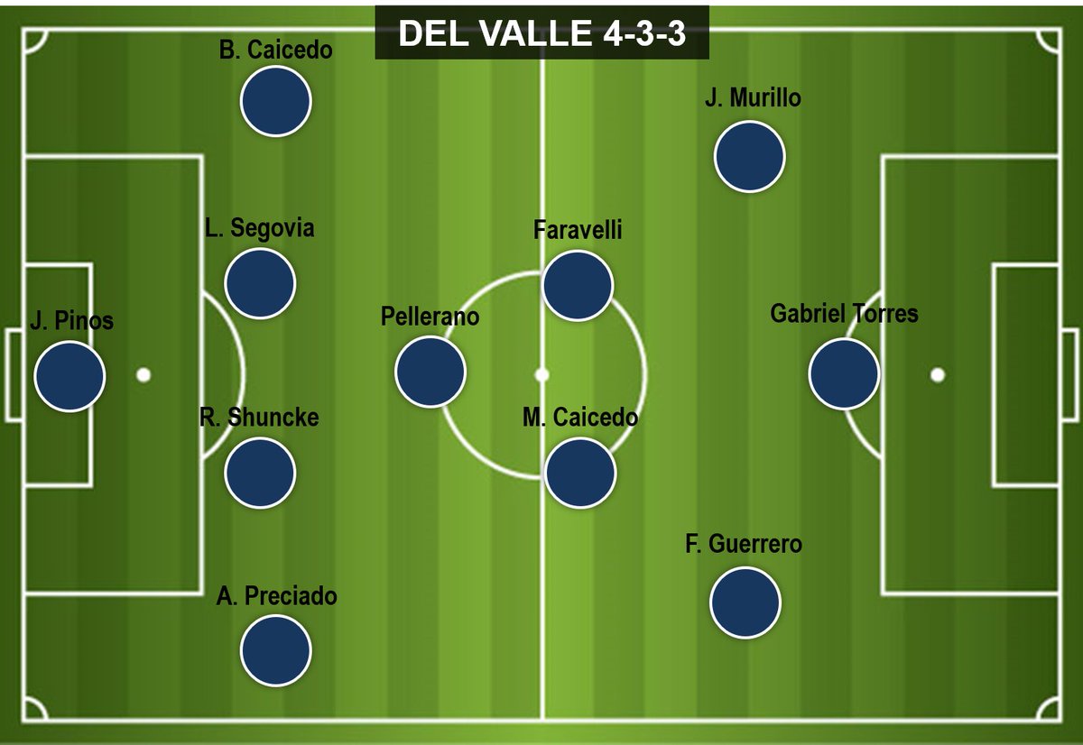 O Del Valle veio em sua plataforma de jogo padrão, o 4-3-3. Pellerano é o principal articulador na saída de bola, fazendo a saída de 3 no meio dos zagueiros e Faravelli e Caicedo ocupam o entrelinhas adversário, buscando dar opção e criar linhas de passe.