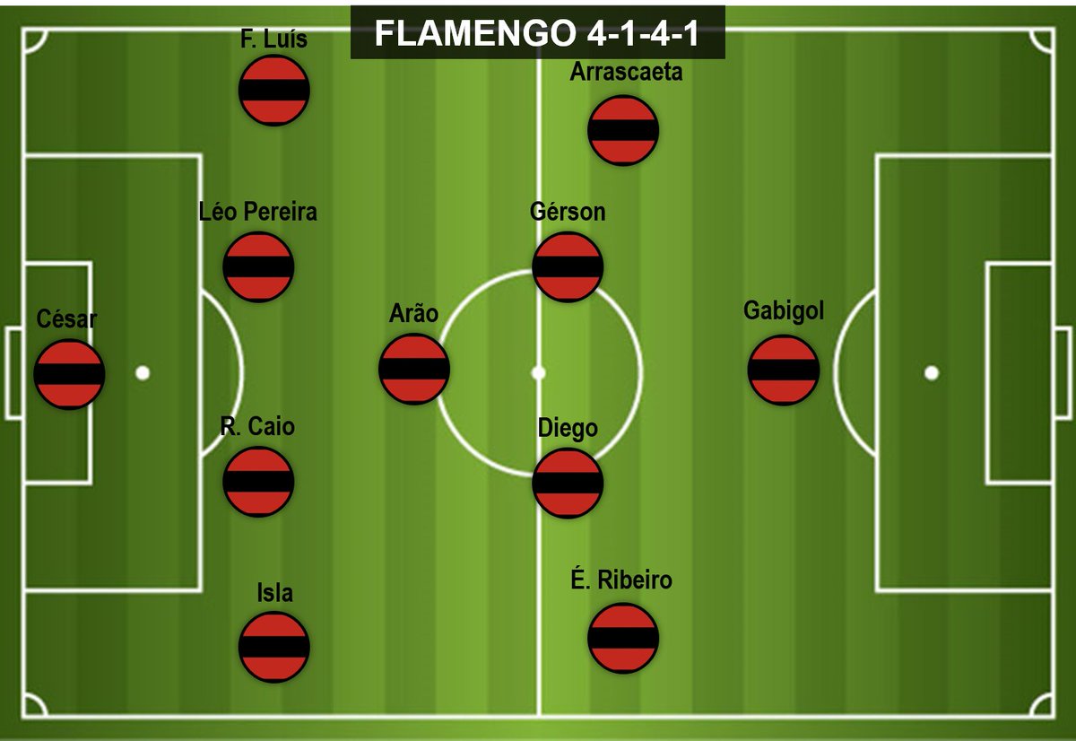 Domè veio com os mesmos 11 iniciais utilizados no jogo contra o Fluminense, mas estruturados numa plataforma tática diferente. Abriu mão do 4-2-3-1 e veio no 4-1-4-1, com Arão entre as linhas e Gabigol como único atacante.