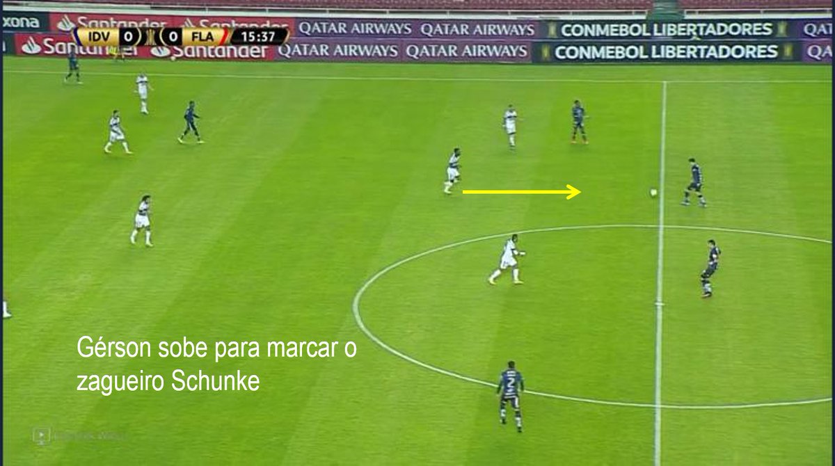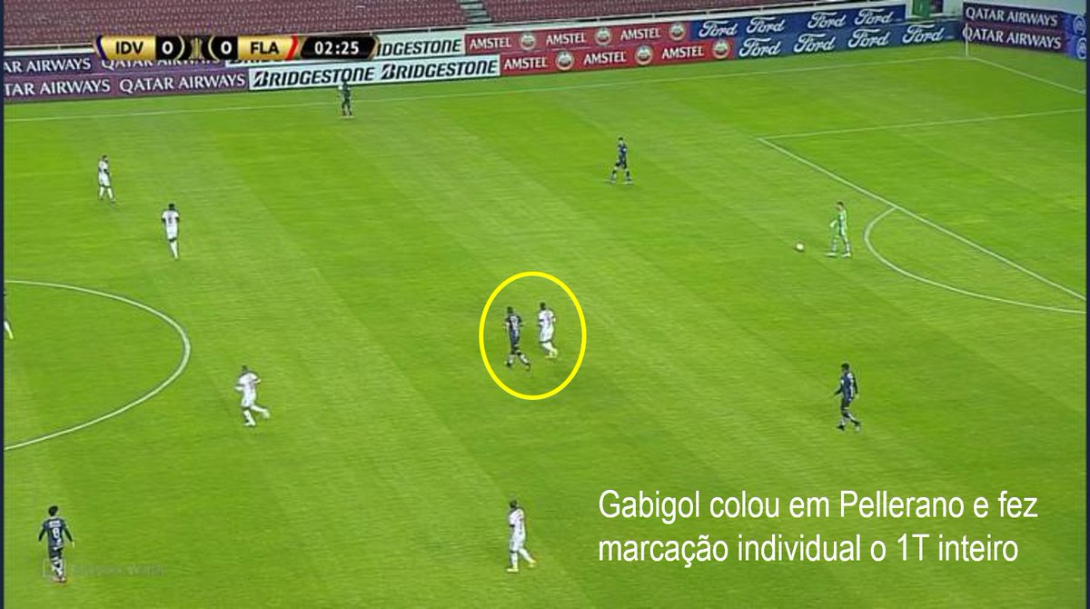 Com Pellerano “fora de combate”, o Fla subia a marcação nos zagueiros quando os mesmos portavam a bola. Gérson subia no zagueiro central e Diego no quarto-zagueiro.