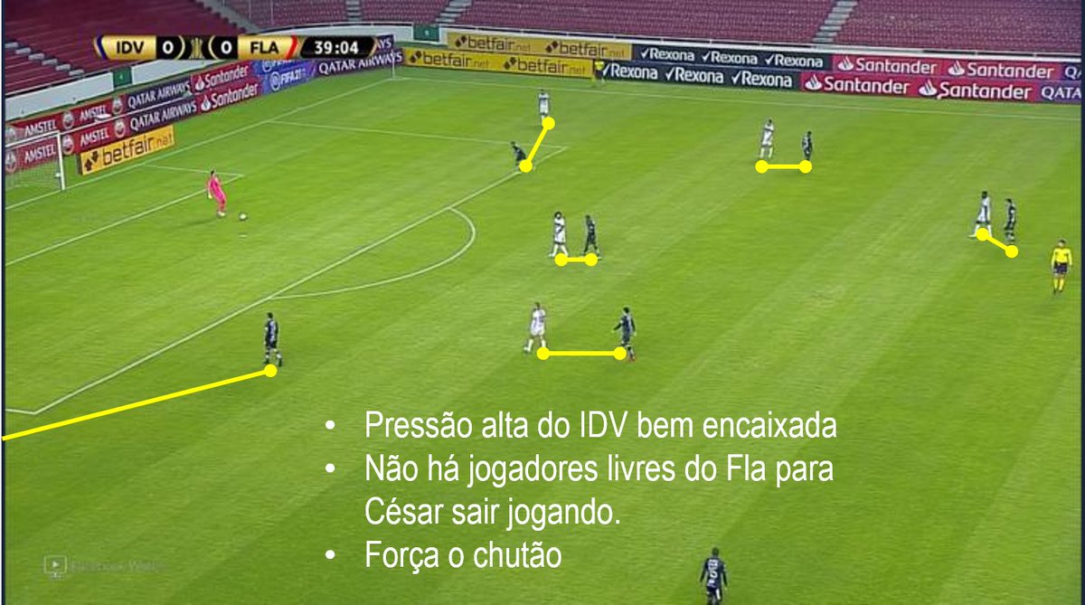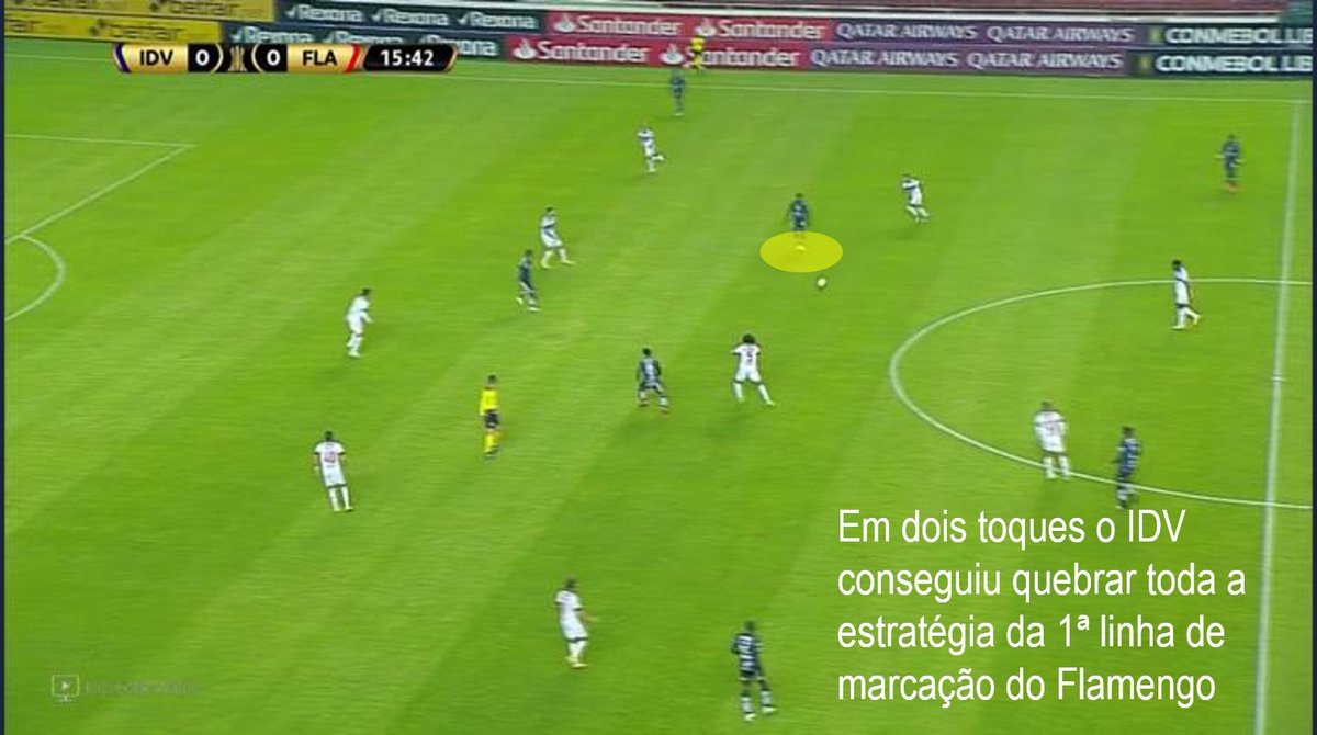 Só que quando essa marcação pressão é feita de forma desordenada e com a linha defensiva baixa, vira um convite ao desespero. Principalmente contra um time tão bom como o IDV, que sabe aproveitar tão bem os espaços. O buraco entre a linha de pressão e a de defesa era evidente.