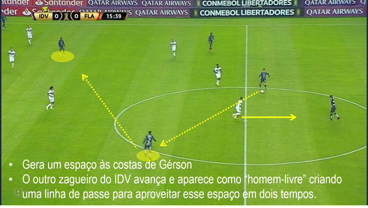 Mesmo sem seu principal construtor na saída, o IDV soube sair jogando com seus zagueiros e usar o “homem-livre” nesses espaços. Arão se via muitas vezes em desvantagem numérica no meio-campo.